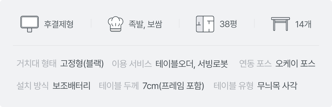 브라운 컬러를 활요한 인테리어에 자연스럽게 녹아들 수 있도록 티오더는 깔끔한 블랙 컬러의 고정형 거치대를 사용해 테이블마다 배치했습니다. 티오더 블랙 컬러 고정형 거치대는 오염에 강하고 파손 우려가 적어 양념이 강한 음식을 판매하는 매장과 주점들에서 선호하는 타입입니다. 설치 방식은 테이블을 붙이고 단체 손님을 받아야 하는 경우가 많아 전기공사가 필요없는 보조배터리를 선택했습니다.